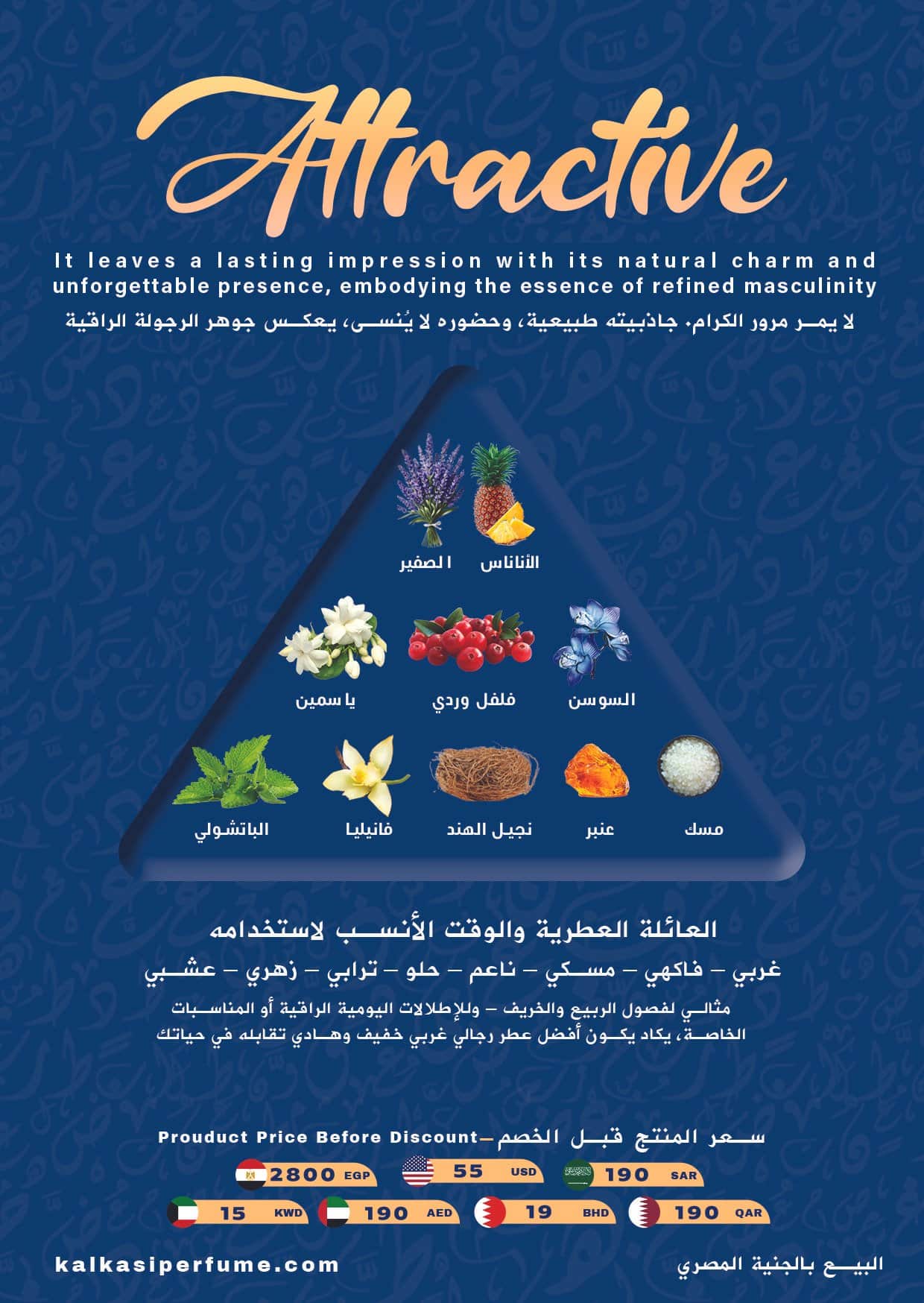 Attractive is a fragrance one cannot overlook or pass by without noticing its impact… it embodies natural magnetism that captivates hearts, and its unique presence precedes you wherever you go.