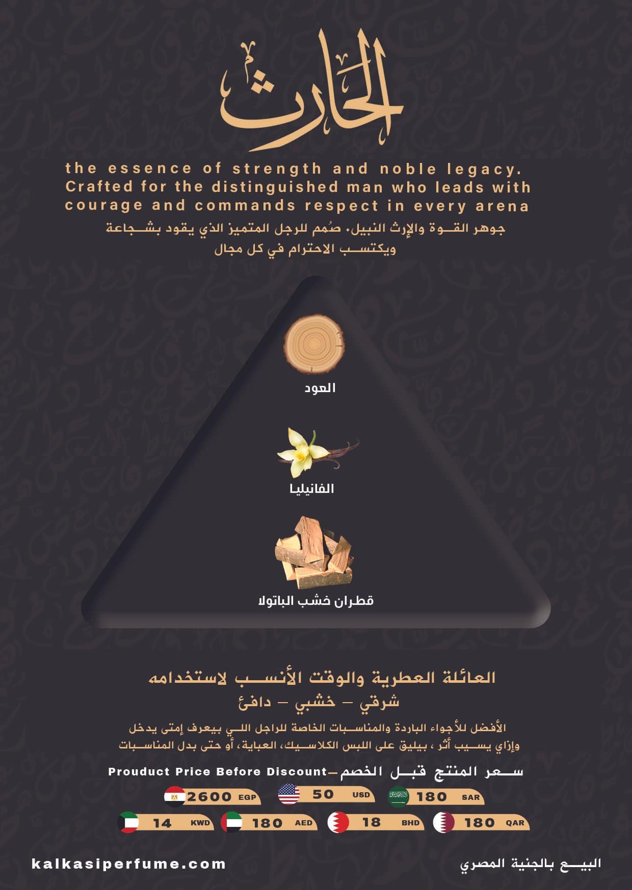 يستمد هذا العطر إلهامه من روح البدو الأصيلة، مع إضافة لمسات عصرية وفاخرة. يجمع الحارث بين عبير العود الطبيعي الغني ونفحات دافئة من الفانيليا، مما يمنحك تجربة عطرية فريدة تأخذك في رحلة ساحرة من اللحظة الأولى حتى آخر لمسة.
