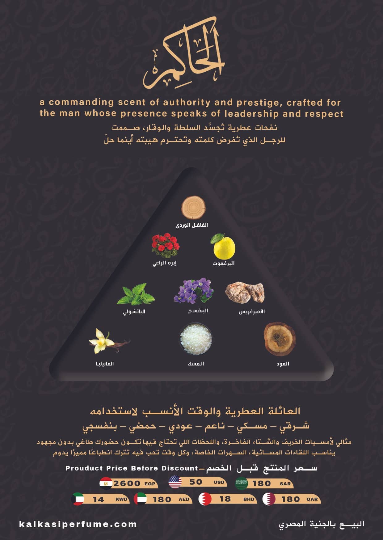 يمتاز “الحاكم” بجوهره الذي يحمل لمسة دخانية حلوة، إضافة إلى لمساته العشبية البلسمية التي تمنحك إحساسًا بقوة الثقة بالنفس. يتميز بتوازن رائع بين التوابل الدافئة والنكهات الحمضية المنعشة، مما يجعله مناسبًا لجميع الأوقات.