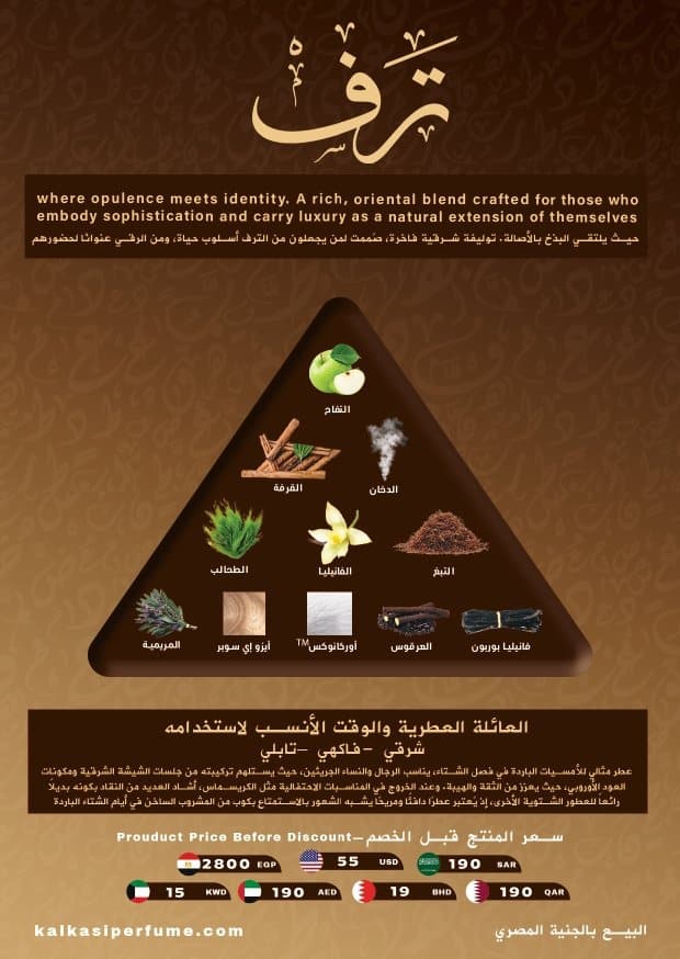 عطر ترف هو تجسيد حقيقي للأناقة الهادئة والفخامة المخفية في كل عنصر من عناصره. تم تصميم هذا العطر خصيصًا للأشخاص الذين يفضلون التميز بأسلوب هادئ، والذين لا يقتصر تأثيرهم على مجرد الحضور السطحي، بل يمتد عمقًا ليترك انطباعًا يدوم طويلاً.