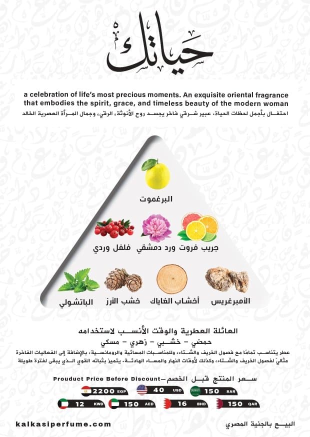 عطر حياتك هو تجربة حسية استثنائية تشكل مزيجاً بين النعومة والقوة والدفء داخل زجاجة واحدة.