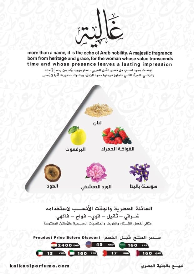 عطر غالية من كلاكاسي للعطور – منبع العطر هو تجسيد للأناقة والرقي، صُمم خصيصًا ليعكس شخصيتك المتميزة: أنثى تفيض بالأناقة، واضحة المعالم، جريئة في اختيارها، ومع ذلك تعرف تمام المعرفة كيف تترك انطباعًا مميزًا في كل مكان تتواجد فيه.